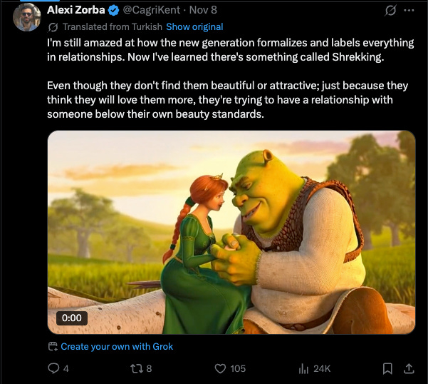 Shrekking is one of those trends that started as a TikTok joke and then became a little too real. The idea is simple: you date someone you’re not fully attracted to because you assume they’ll worship the ground you walk on and therefore can’t hurt you. Creators joke on TikTok, “even my Shrek had the audacity to ghost.” Gagged.
